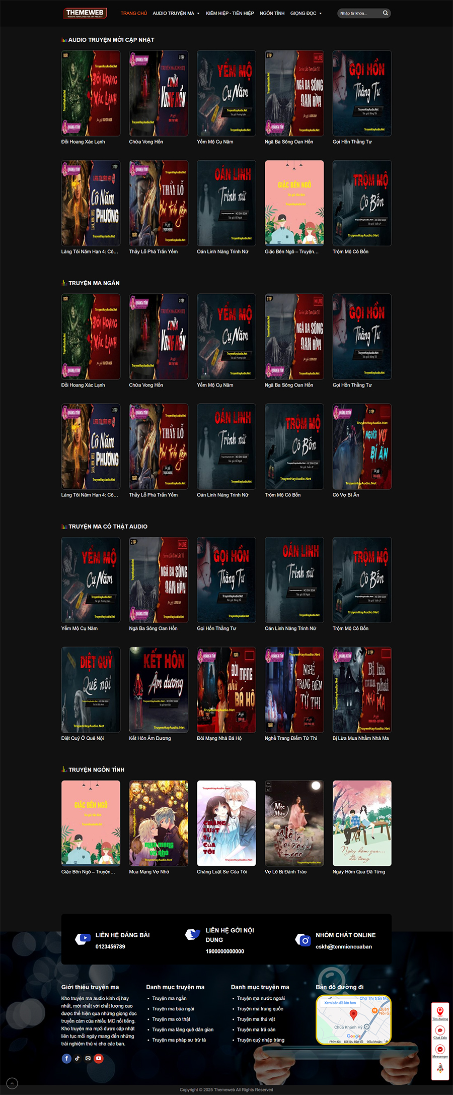 Mẫu website truyện ma online này được phát triển từ theme flatsome dành cho website truyện ma online , được thiết kế trên nền tảng CMS WordPress đẹp mắt và linh hoạt để phù hợp với website Phù hợp với website truyện ma online, truyện audio, truyện ngắn online… Mẫu website truyện ma online này là mẫu website đã hoàn chỉnh Quý Khách chỉ việc cài lên hosting là sử dụng như một website thông thường