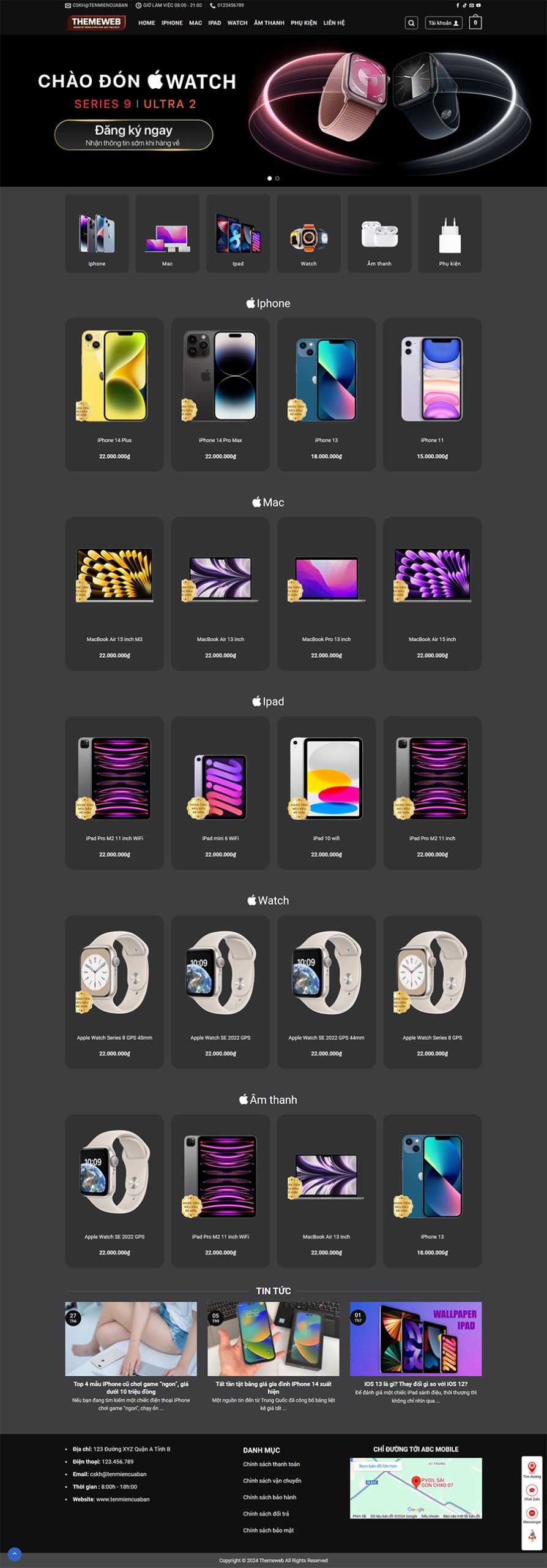 Mẫu website shop bán sản phẩm apple này được phát triển từ theme flatsome dành cho website shop bán hàng apple , được thiết kế trên nền tảng CMS WordPress đẹp mắt và linh hoạt để phù hợp với website bán hàng điện thoại apple, máy tính bảng, máy mac, đồng hồ watch…Giao diện website apple này là mẫu website đã hoàn chỉnh Quý Khách chỉ việc cài lên hosting là sử dụng như một website thông thường